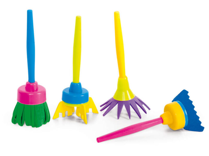 Šluostės – šepečiai su putplasčio antgaliu ir plastikine rankena. Išmirkykite šluostes dažuose, o tada jomis galite daryti antspaudus arba tapyti, išgaudami įvairias tekstūras.