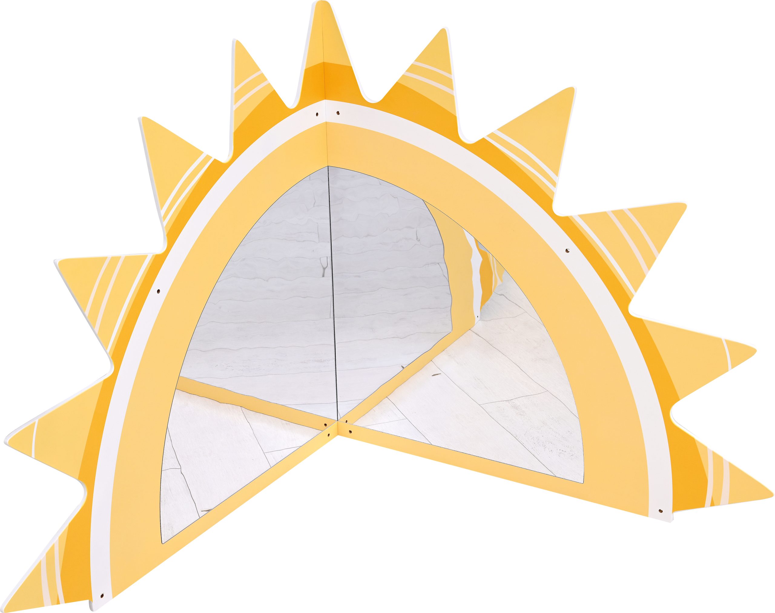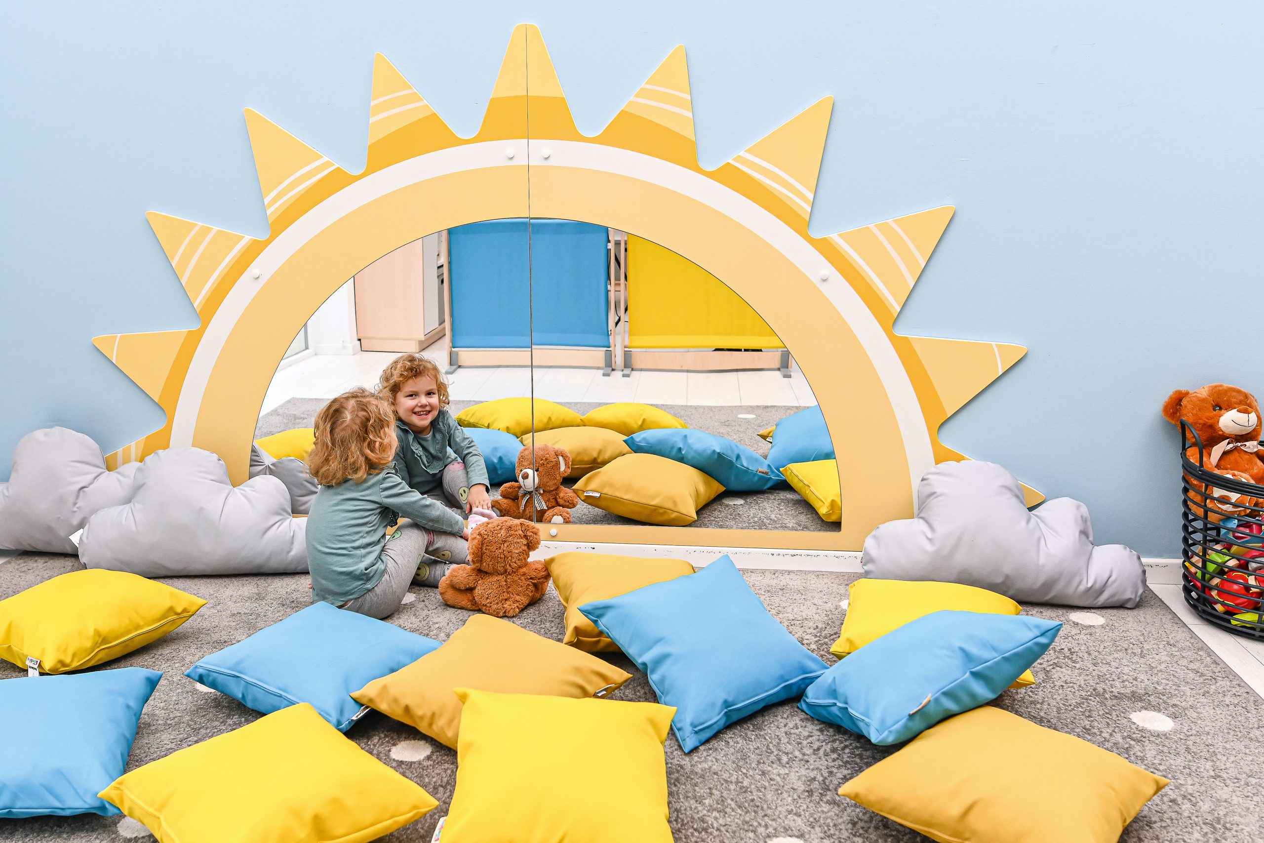 Veidrodis su saulės formos apvadu. Aplikacija pagaminta iš spausdintos MDF plokštės. Veidrodis yra saugus vaikams. Jį galima naudoti kaip kambario dekoraciją, kad vaikai susipažintų su savo išvaizda. Jis padeda atlikti adaptyvius žaidimus ir daro įtaką vaiko emocinei raidai. Žaidžiant su veidrodžiu formuojasi mažylio tarpasmeniniai ir socialiniai įgūdžiai. Tvirtinamas prie sienos. Gaminį galima derinti su įvairiais čiužiniais ir pagalvėmis.