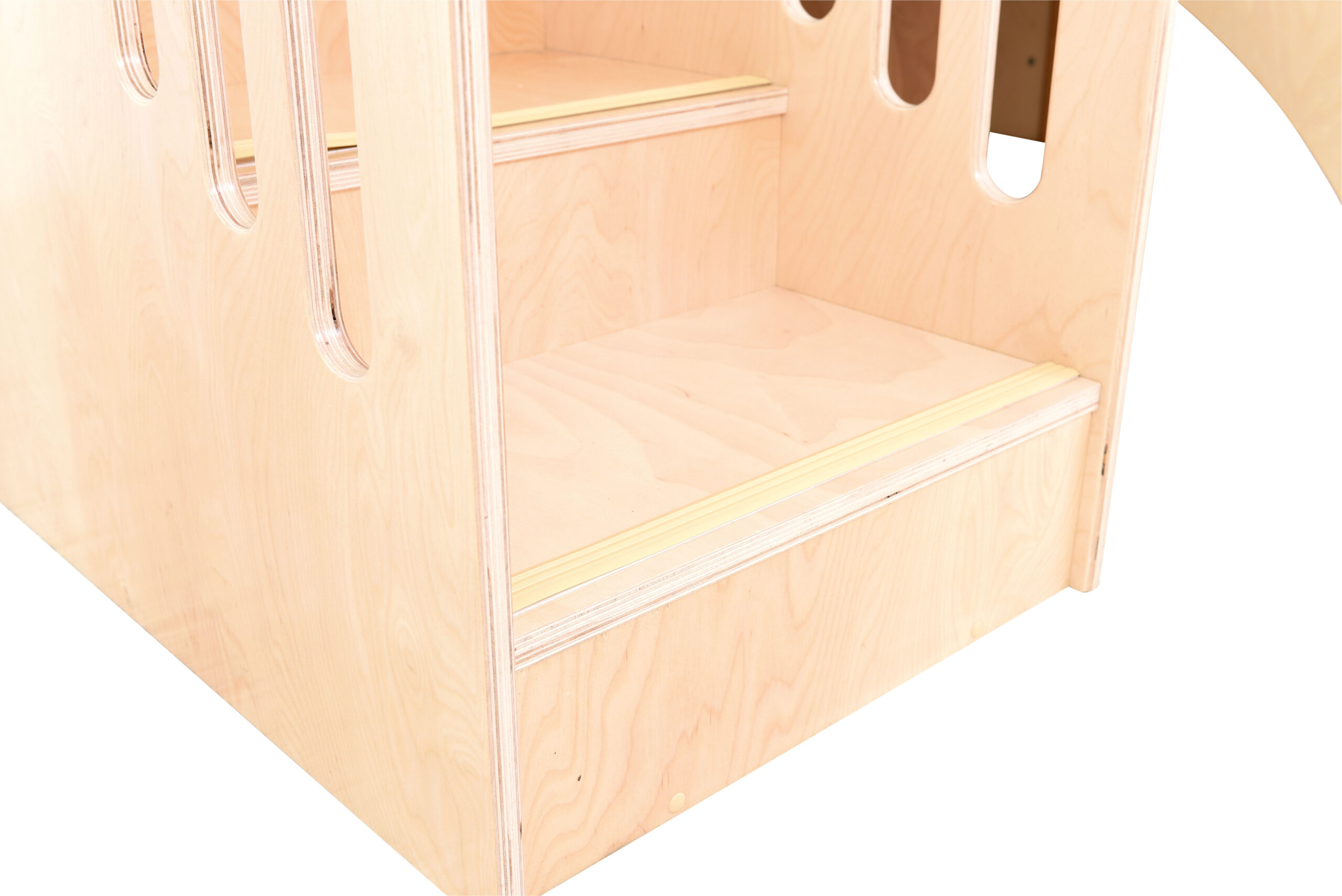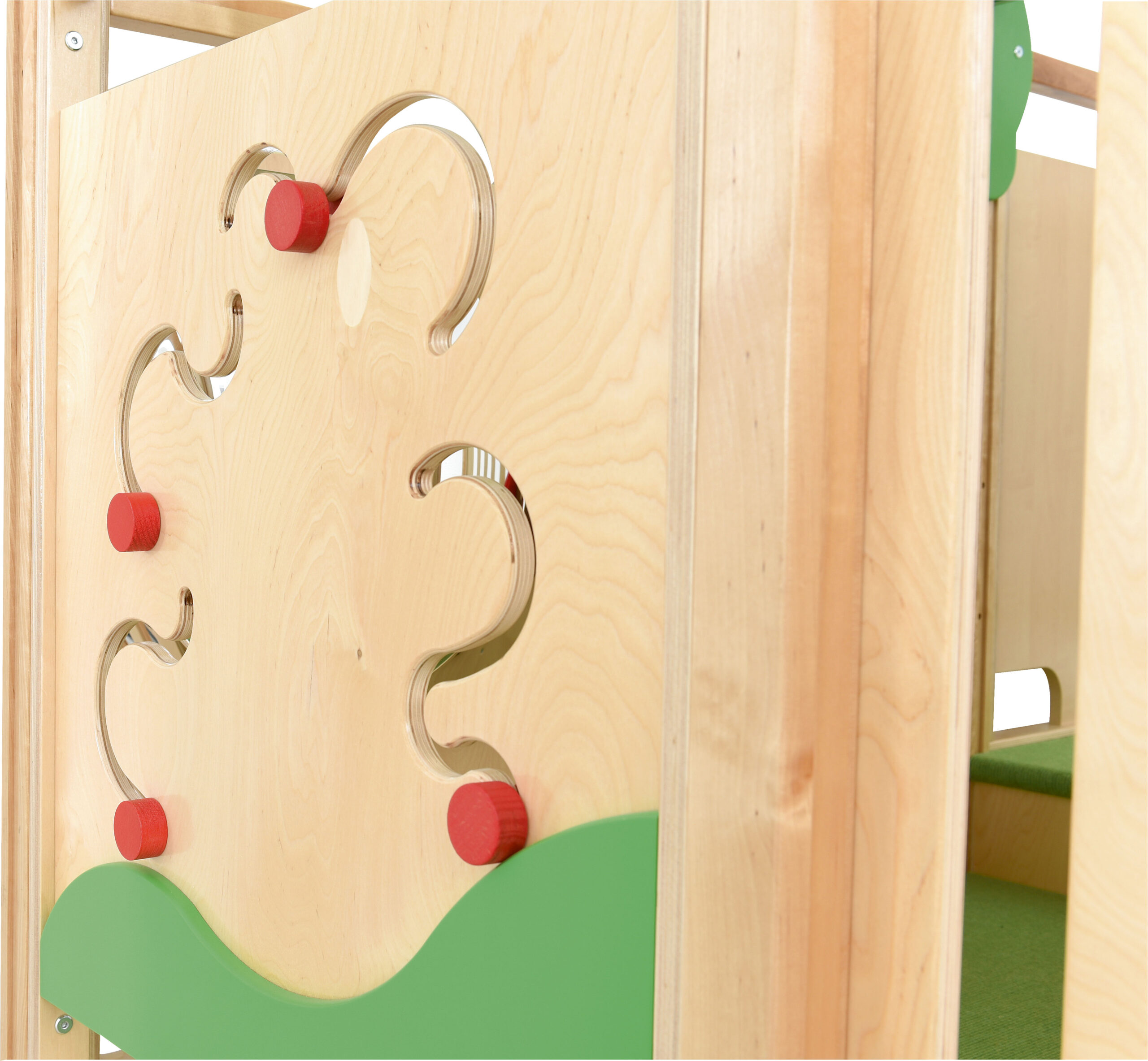 Žaidimų kampelis su daugybe atrakcionų – čiuožykla, laiptais, ropojimo tuneliu, veidrodžiu, sienų labirintais. Pagamintas iš faneros, medžio, laminuotos plokštės ir spalvotos MDF plokštės. – Mat. 186 x 209,2 x 193 cm – platformų aukštis: 45 ir 60 cm – laiptų mat. 59,5 x 86 cm – platformos mat. 55 x 72 cm ir 66 x 123 cm – čiuožykla mat. 46 x 132,5 cm – tunelio mat. 47,5 x 38,5 cm – skylė medyje mat. 40 cm