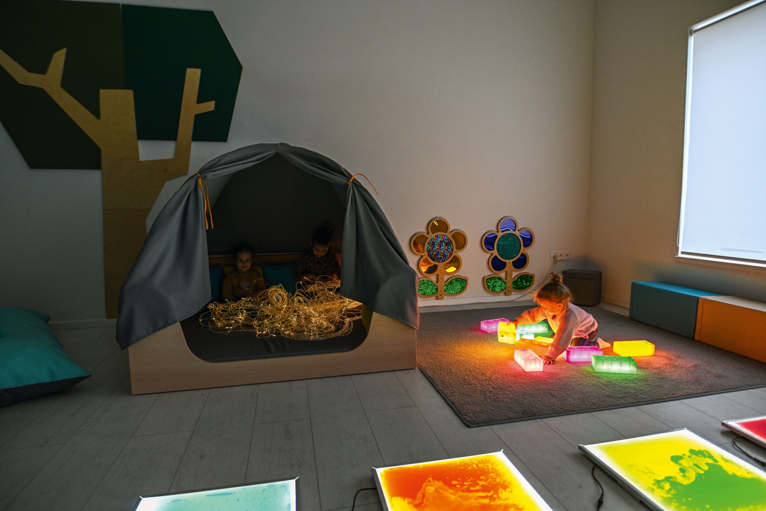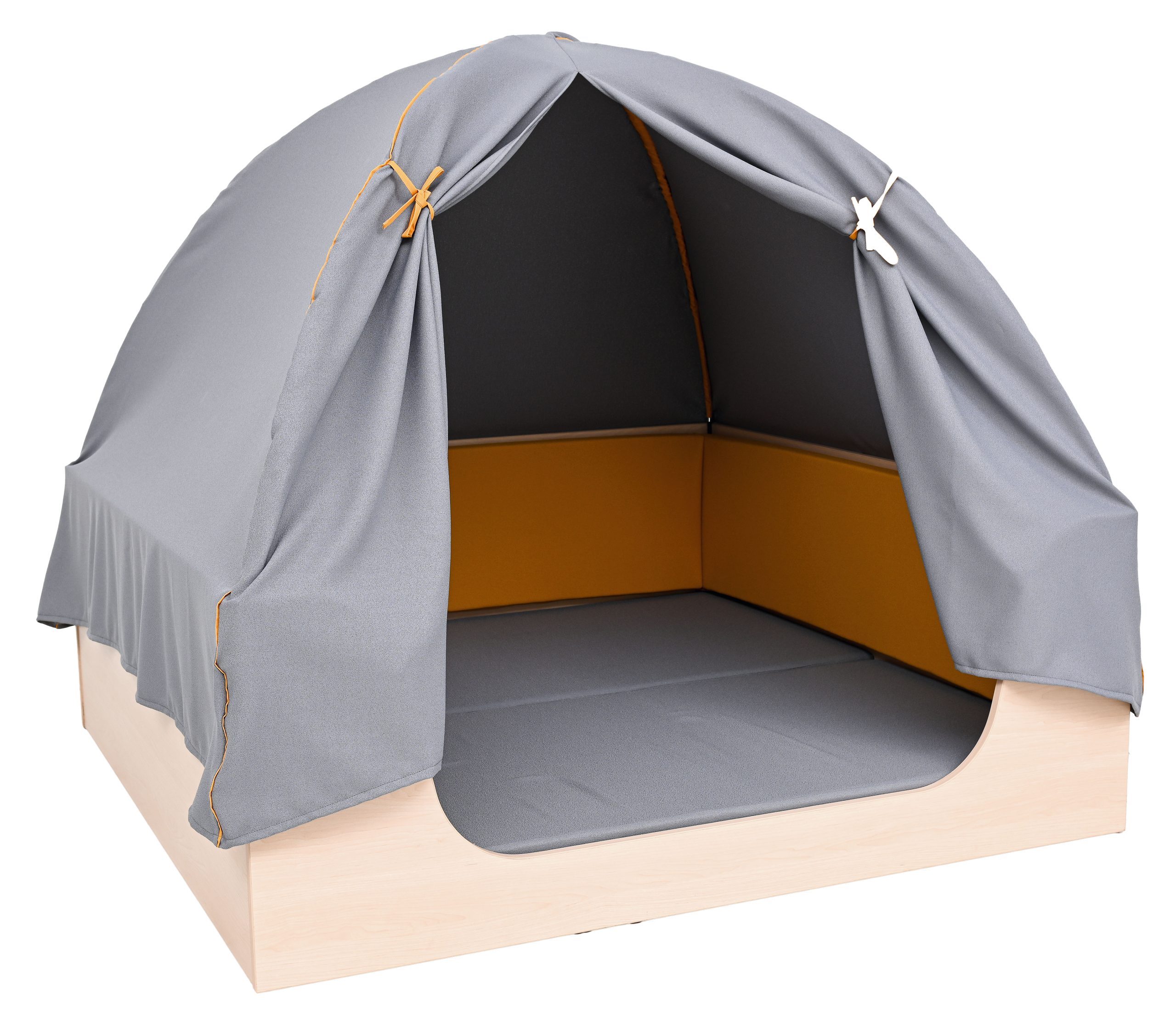 Jaukus kampelis su stogeliu, kuriame galima žaisti ir ilsėtis. Santūri atmosfera leidžia vaikams nusiraminti ir susikaupti ties savo emocijomis ir mintimis. Minkšti grindų ir sienų apmušalai suteikia šilumos ir jaukumo.