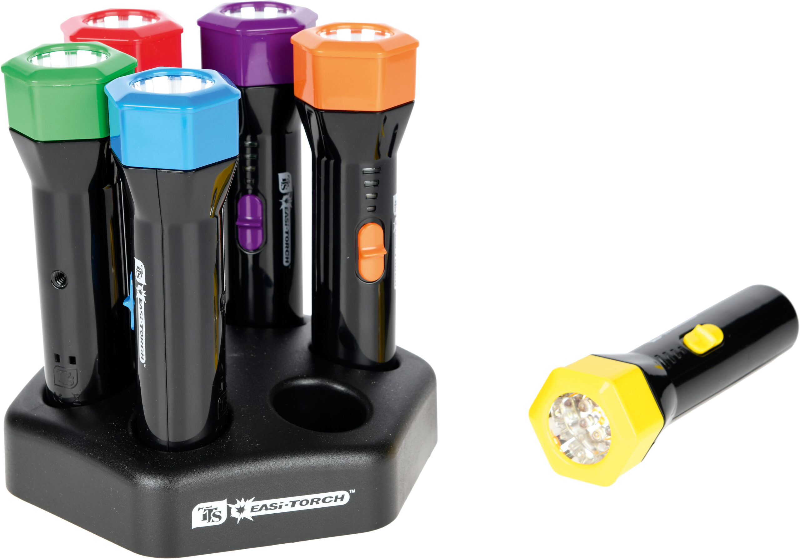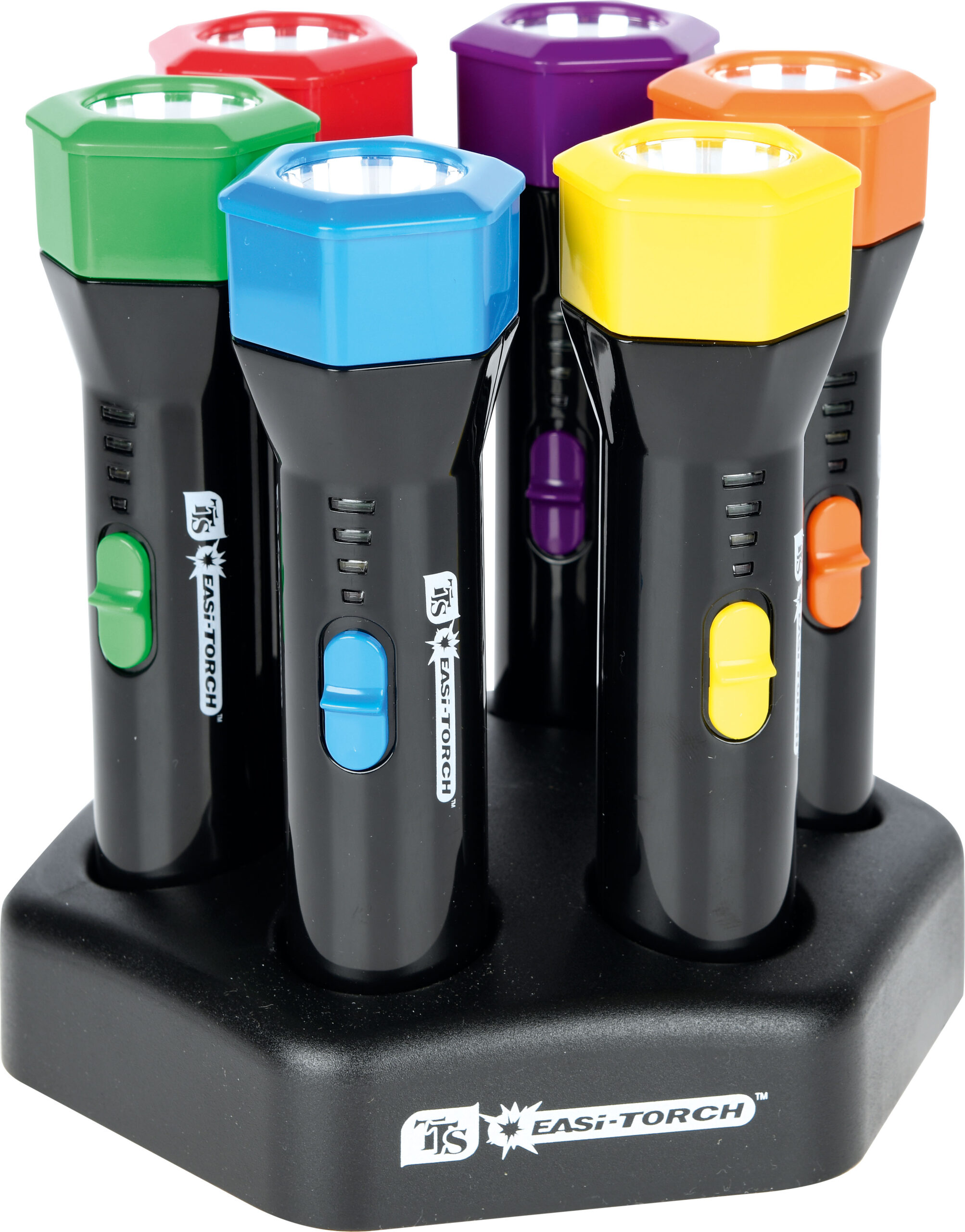 Į komplektą įeina įkrovimo pagrindas ir 6 vnt. žibintuvėlių.